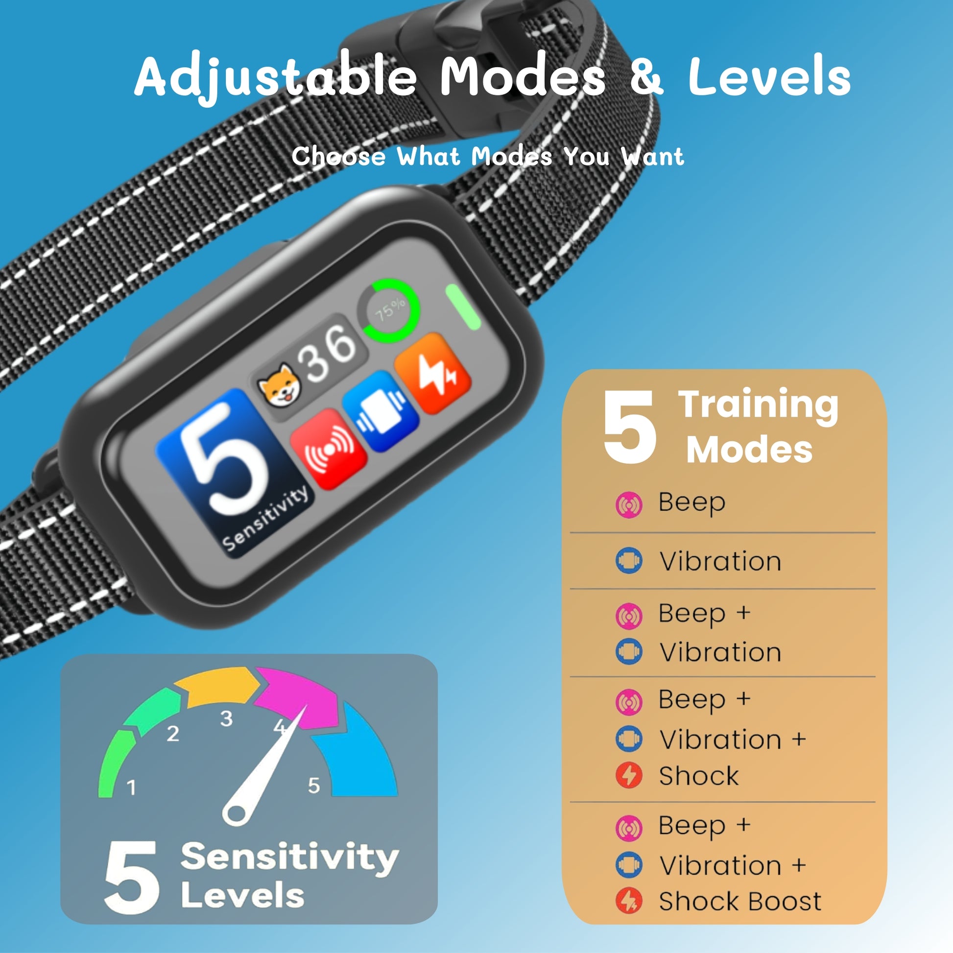 I really like the adjustable vibration intensity, but I prefer to use the lowest setting. If you're looking for a feature-rich, compact electronic collar, this one is worth considering.