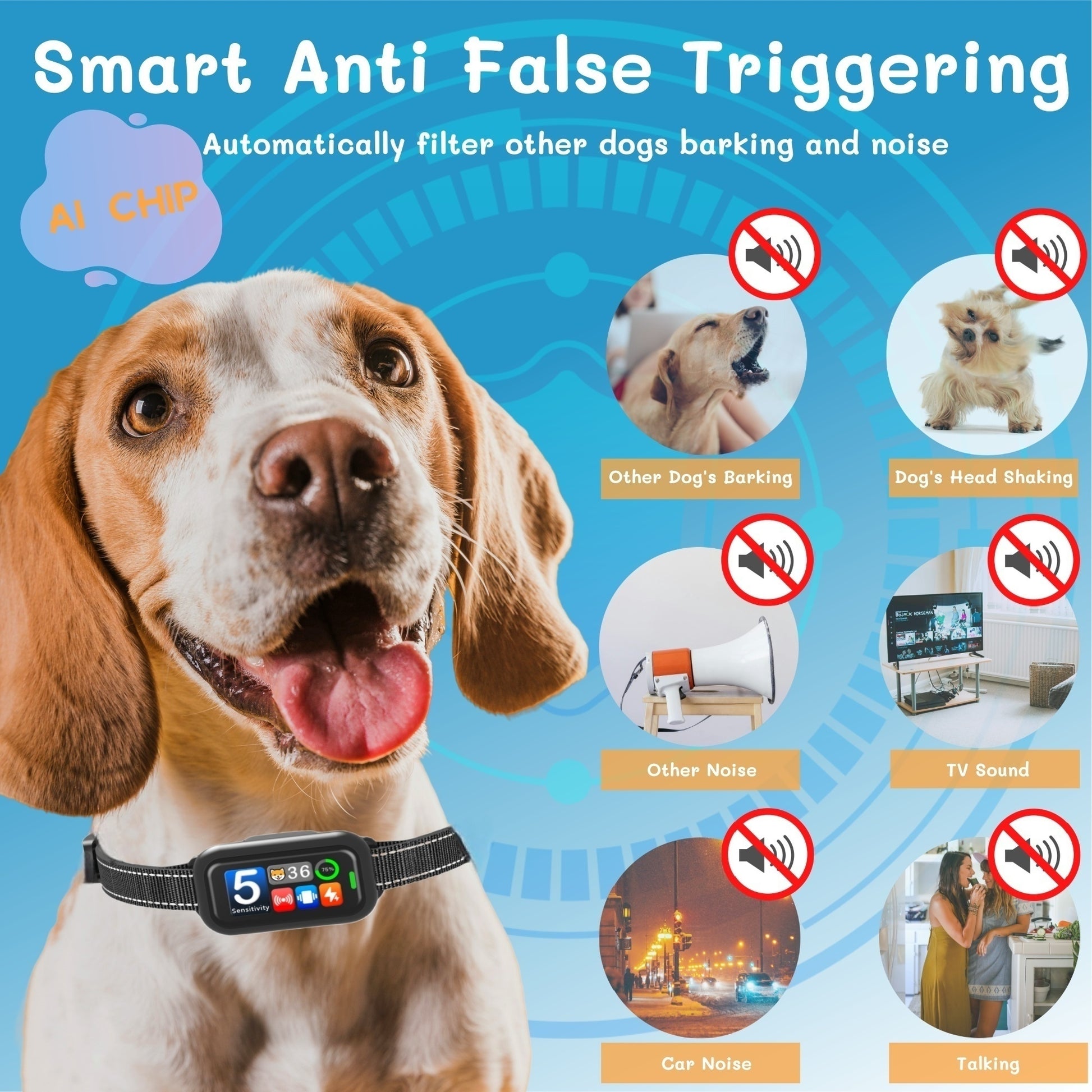 - Precise Bark Detection & Reduced False Triggers: Equipped with intelligent anti-interference technology, this smart barking collar accurately detects your dog’s bark while minimizing false triggers caused by other dogs’ barking, head shaking, vehicle noise, or surrounding sounds. The anti-barking device activates only when your dog actually barks, ensuring accurate and humane training without unnecessary corrections.